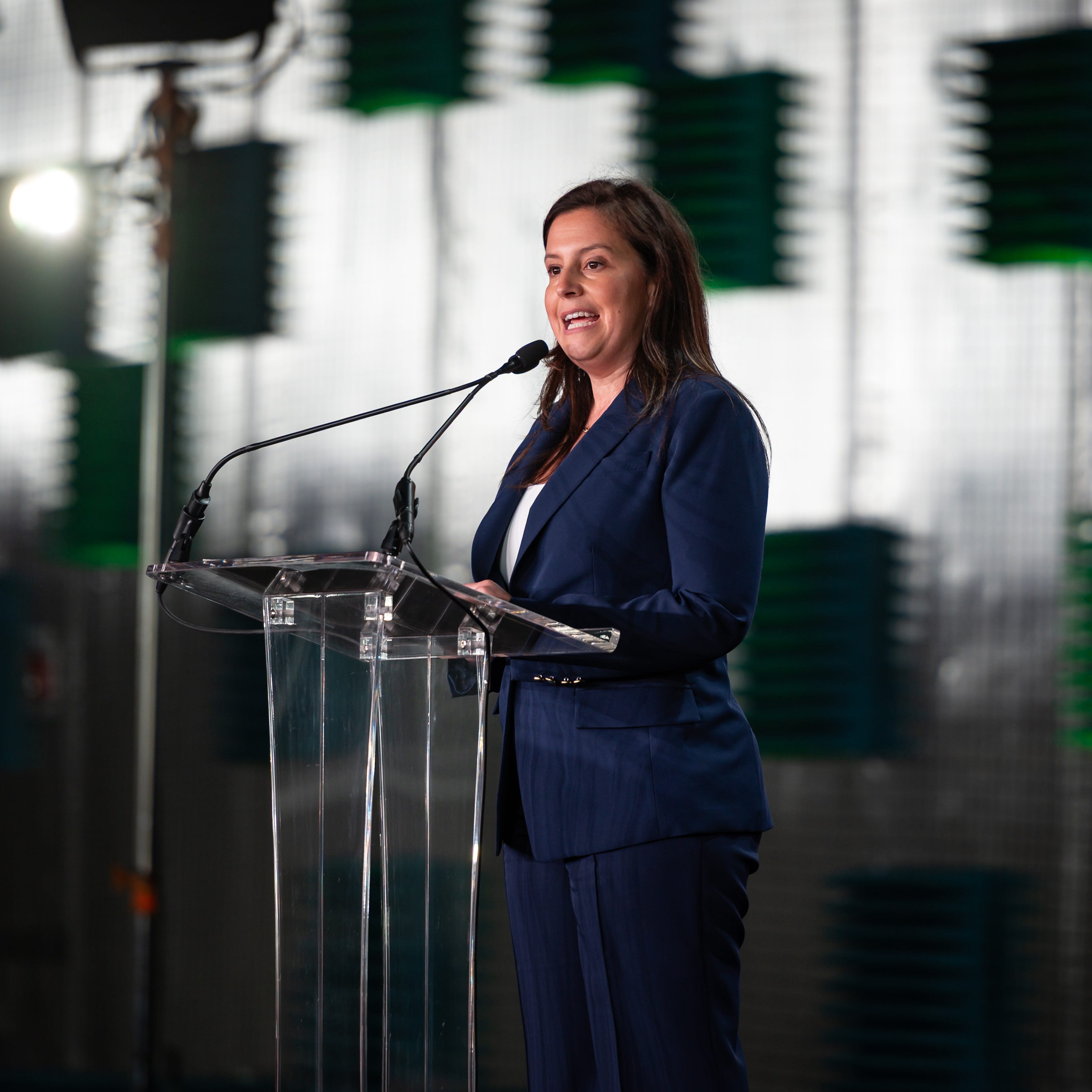 United States Representative Elise Stefanik addresses the crowd at Griffiss International Airport in Rome, NY on Tuesday, April 22, 2025.