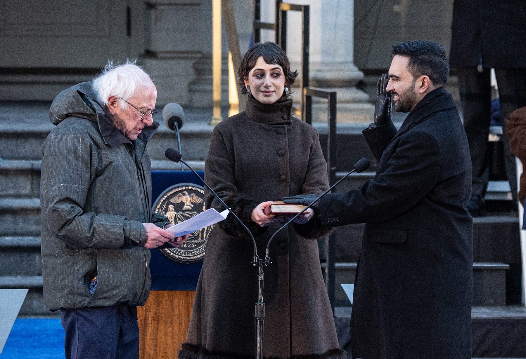 New York City Mayor Zohran Mamdani and his wife Rama Diwali walk out of city hall at the start of his public inauguaration Jan. 1, 2026.