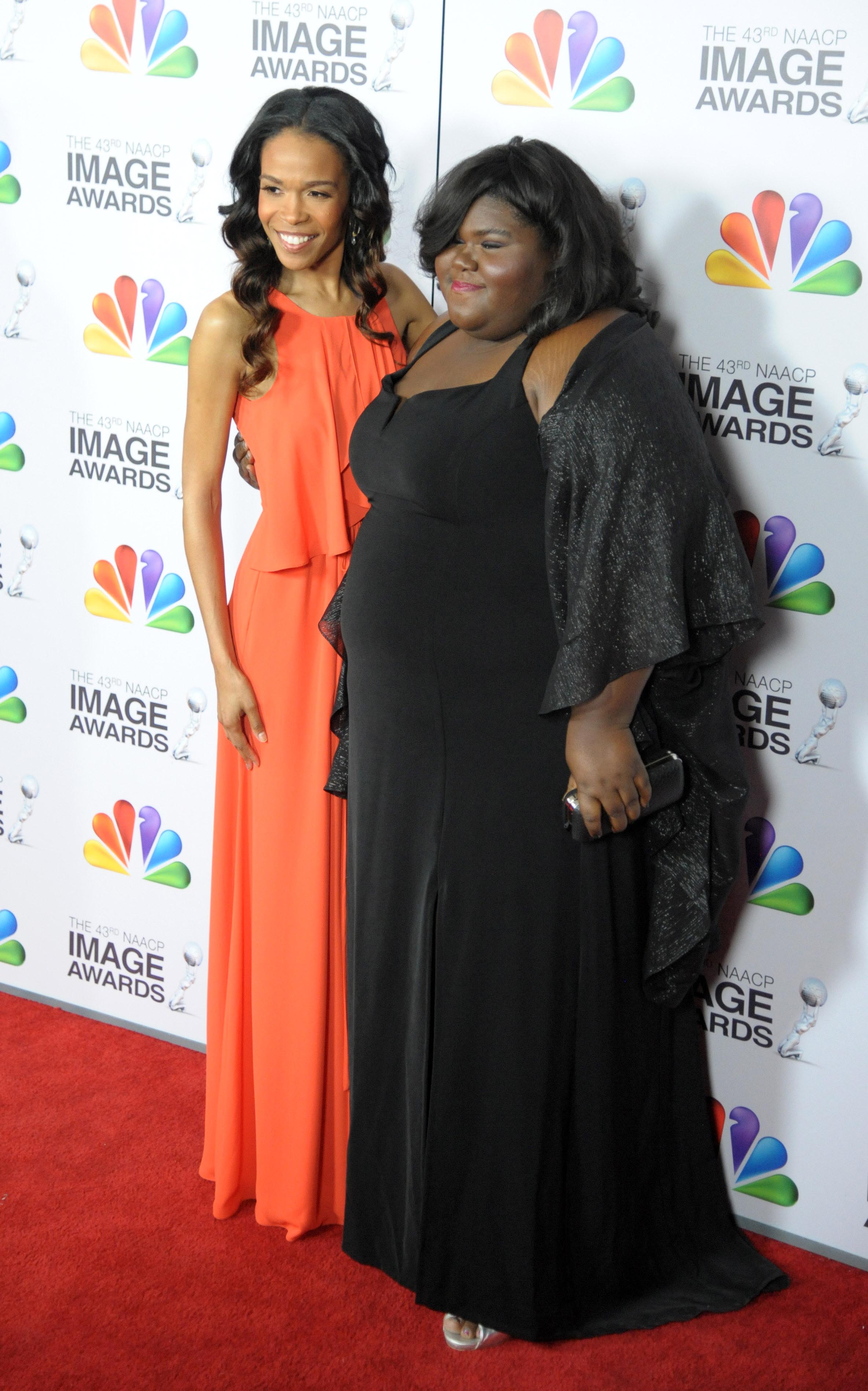 Feb 17, 2012; Los Angeles, CA, USA; Destiny’s Child singer Michelle Williams (left) and actress Gabourey Sidibe arrive at the 43rd NAACP Image Awards at the Shrine Auditorium. Mandatory Credit: Kirby Lee/Image of Sport-Imagn Images