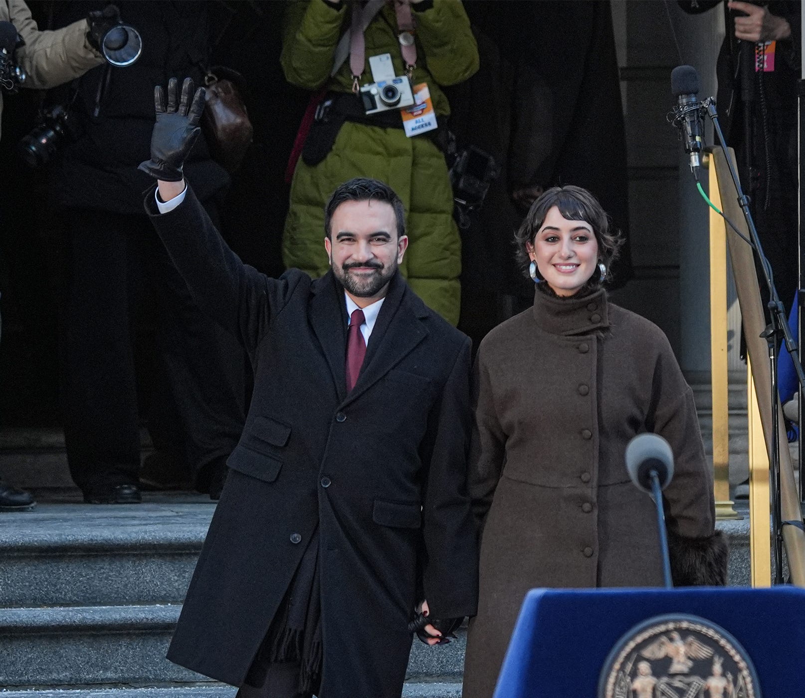 New York City Mayor Zohran Mamdani and his wife Rama Diwali walk out of city hall at the start of his public inauguaration Jan. 1, 2026. / Imagn